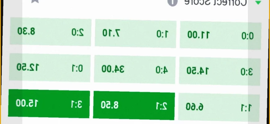 - Точный счет (Correct Score): Предполагаемый финальный счет матча.